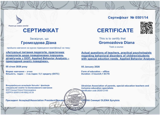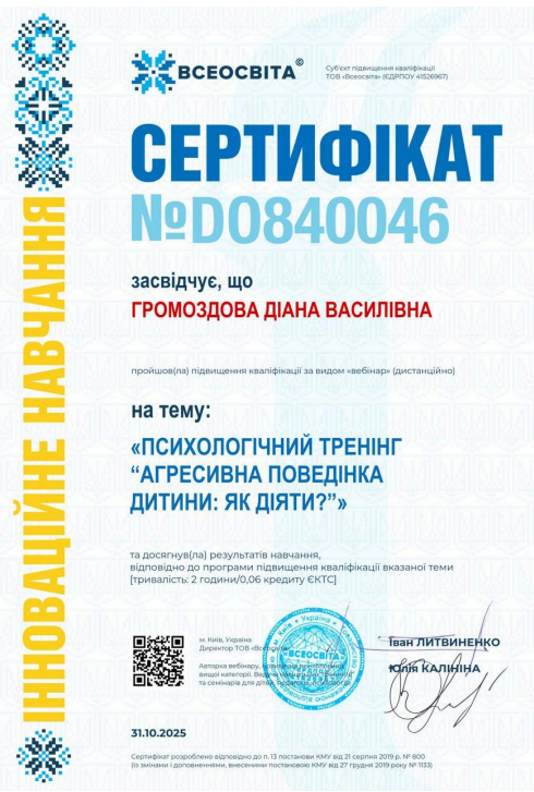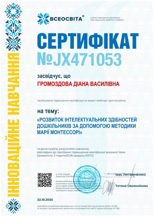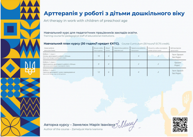 25 вересня 2025 року закінчила курс «Арттерапія у роботі з дітьми дошкільного віку».